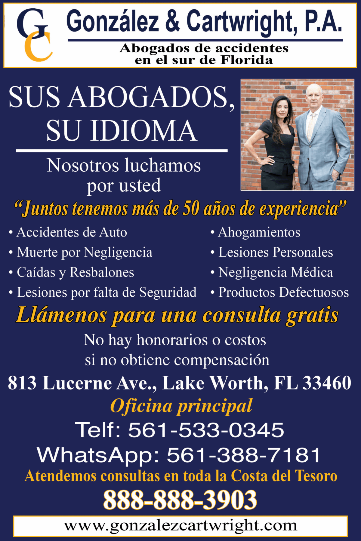 Categoría Abogados 813 Lucerne Ave Ciudad Lake Worth ZIP Code 33460 Website http://www.gonzalezcartwright.com Teléfono 561-533-0345 Email agonzalez@gonzalezcartwright.com Fax 561-533-0195