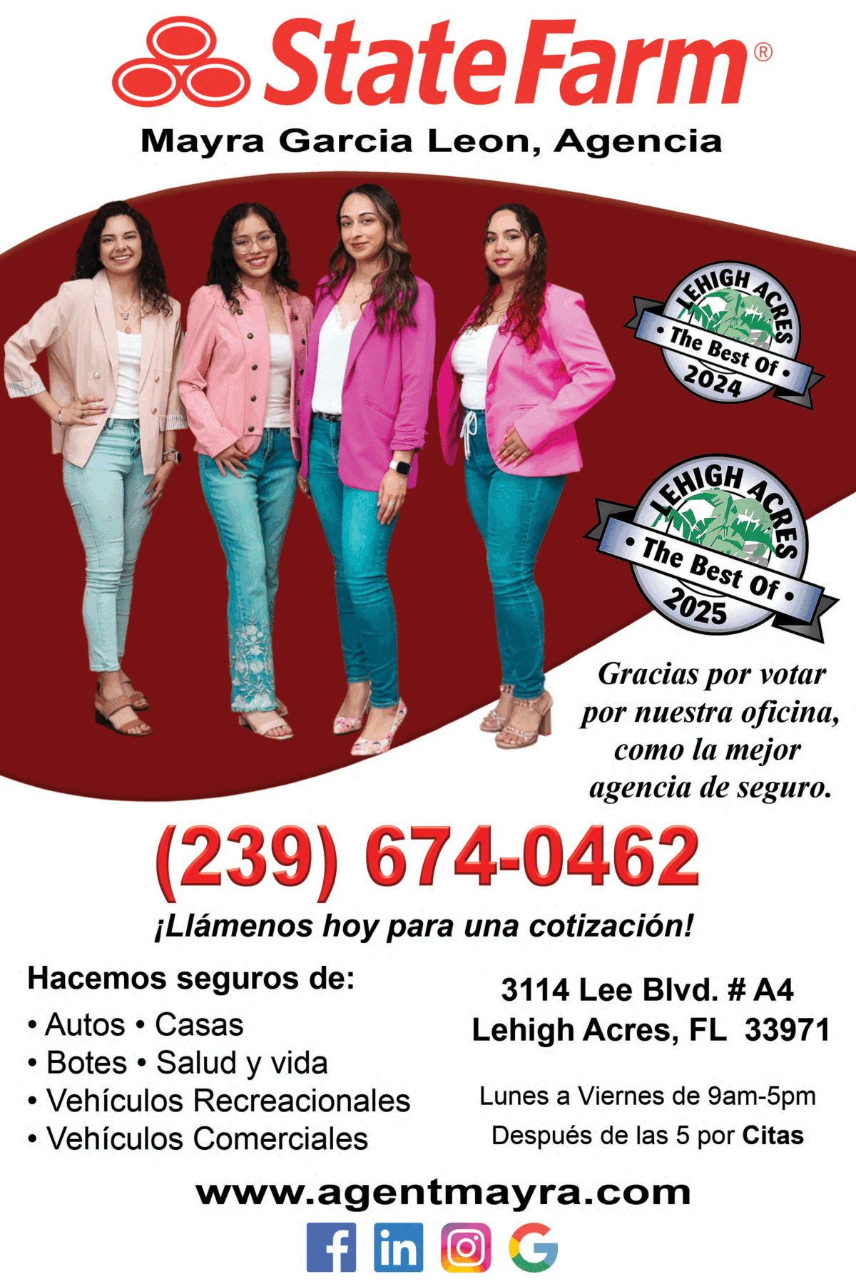 Categoría Seguros 3114 Lee Blvd Ste A4 Ciudad Lehigh Acres Estado FL ZIP Code 33971 Website https://www.agentmayra.com Teléfono 239-674-0462 Email mayra@agentmayra.com
