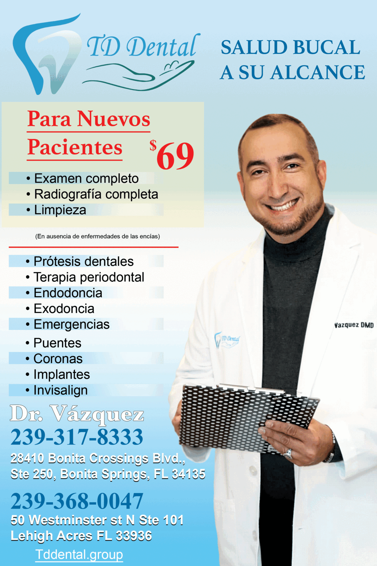 Categoría Dentistas, Dentists 28410 Bonita Crossings Blvd Ste 250 Ciudad Bonita Springs Estado FL ZIP Code 34135 Website https://tddental.group/ Teléfono 239-317-8333 Email xddentalinc@gmail.com