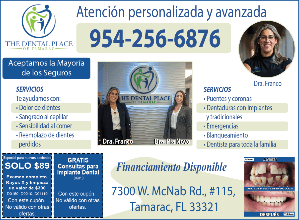 Categoría Dentistas 7300 W. McNab Rd # 115 Ciudad Tamarac Estado FL ZIP Code 33321 Website http://www.thedentalplaceoftamarac.com Teléfono 954-722-0100